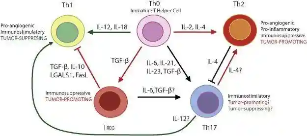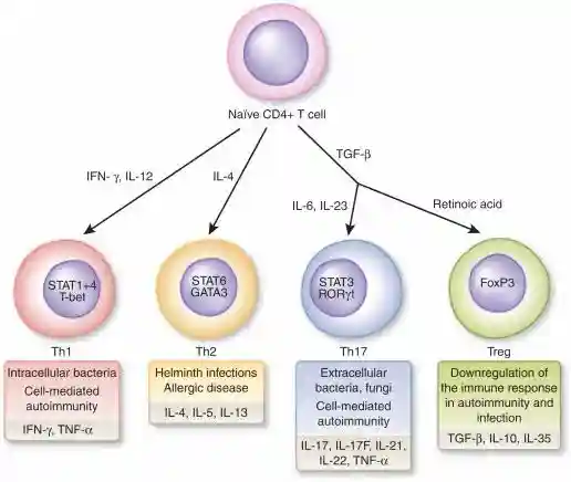 同样,当Th0细胞到达富含IL-4或IL-6和TGF-β的战斗部位时,它们分别可以变成Th2或Th17细胞。因此,Th0细胞可以被战场上的细胞因子环境“转化”为Th1、Th2或Th17细胞。