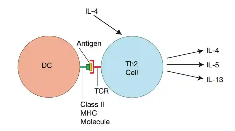 这种相互作用导致该类辅助性T细胞“编程”产生Th2细胞因子亚群,包括IL-4、IL-5和IL-13。读到这里或许你想问的是有那么多种其他类型的细胞因子,为什么偏偏是IL-4、IL-5和IL-13?——其实这是由细胞因子的功能作用所决定的。