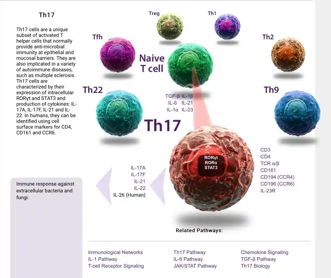 产生Th17细胞因子谱的辅助性T细胞的是最近才发现的,目前对Th17细胞的了解比对Th1和Th2细胞要少,其中一个原因是Th17细胞的功能——在抵御真菌的过程中发挥作用,而免疫系统对真菌攻击的反应还没有像对细菌或病毒的免疫防御那样得到很好的研究。因此,关于Th17细胞的报道还不完整。