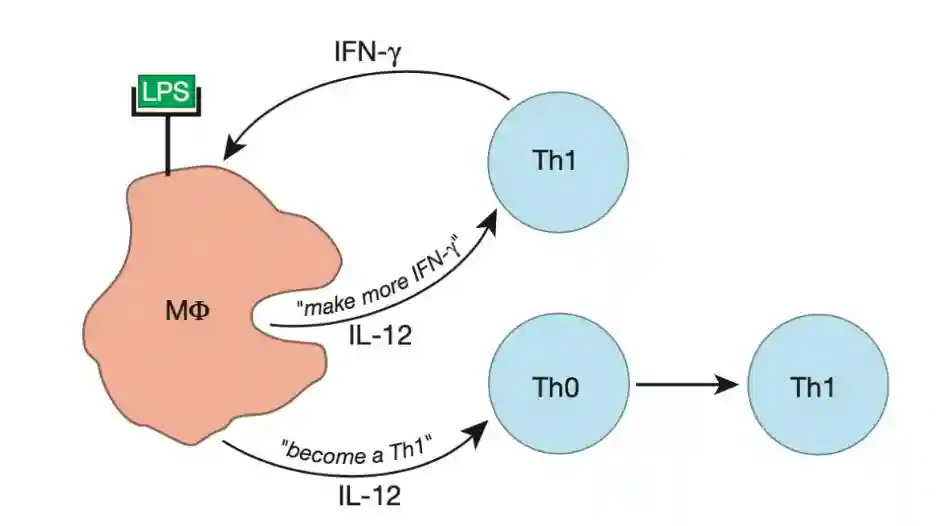 例如,当Th0细胞离开血液以对抗组织中的细菌感染时,它们会遇到富含IL-12的环境。这是因为已经在那里对抗细菌的Th1细胞会产生干扰素-γ,这种细胞因子与细菌的LPS等危险信号一起激活组织巨噬细胞,后者分泌大量IL-12。当Th0细胞接收到IL-12信号时,他们就会意识到该处正在进行什么类型的战斗,并致力于成为Th1细胞——产生抵御细菌所需的细胞因子。