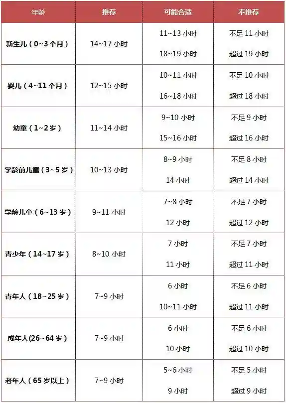美国国家睡眠基金会给出一个各个年龄段的睡眠时间建议,不过有个体差异是正常的。
