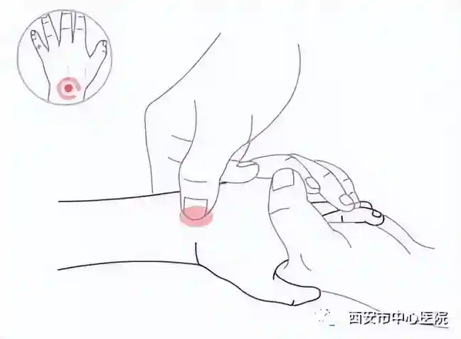 治疗腹痛要穴,位于手背腕横纹正中凹陷处。顺时针重揉,时间约3分钟。