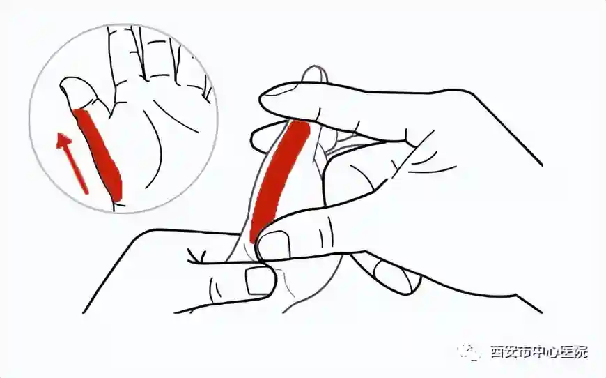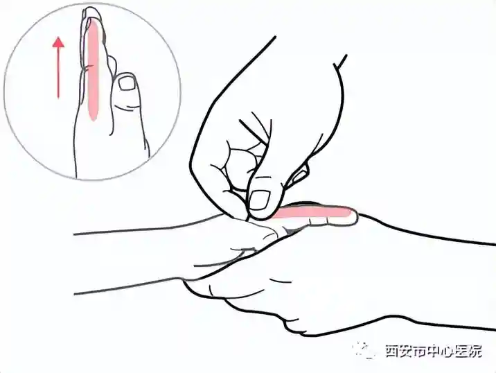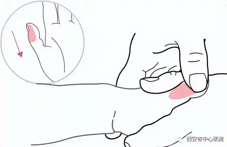 从拇指桡侧缘由指尖向指根方向直推,约200-300次,可起到健脾胃、补气血的作用,也是日常的保健穴。