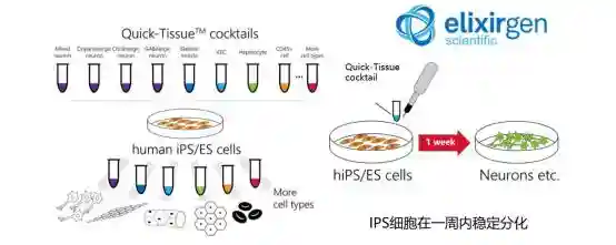 ElixirgenScientific公司的Quick-Tissue™技术,用转录因子衍生的试剂覆在人iPS细胞上的简便方法,可以实现高速分化,使iPS细胞在一周内稳定分化,大大提高iPS细胞分化效率。