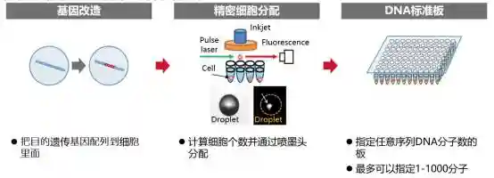 首先将目的遗传基因配列到细胞里面,完成细胞的基因改造;再根据需要计算细胞个数并通过喷墨头精密分配;可以制作指定任意序列DNA分子数的板。这些DNA标准板可以用于检验设备和试剂的精度管理,保证低分子量时的检测精度,目前,这种DNA标准板已经实现产品化并将很快发布。