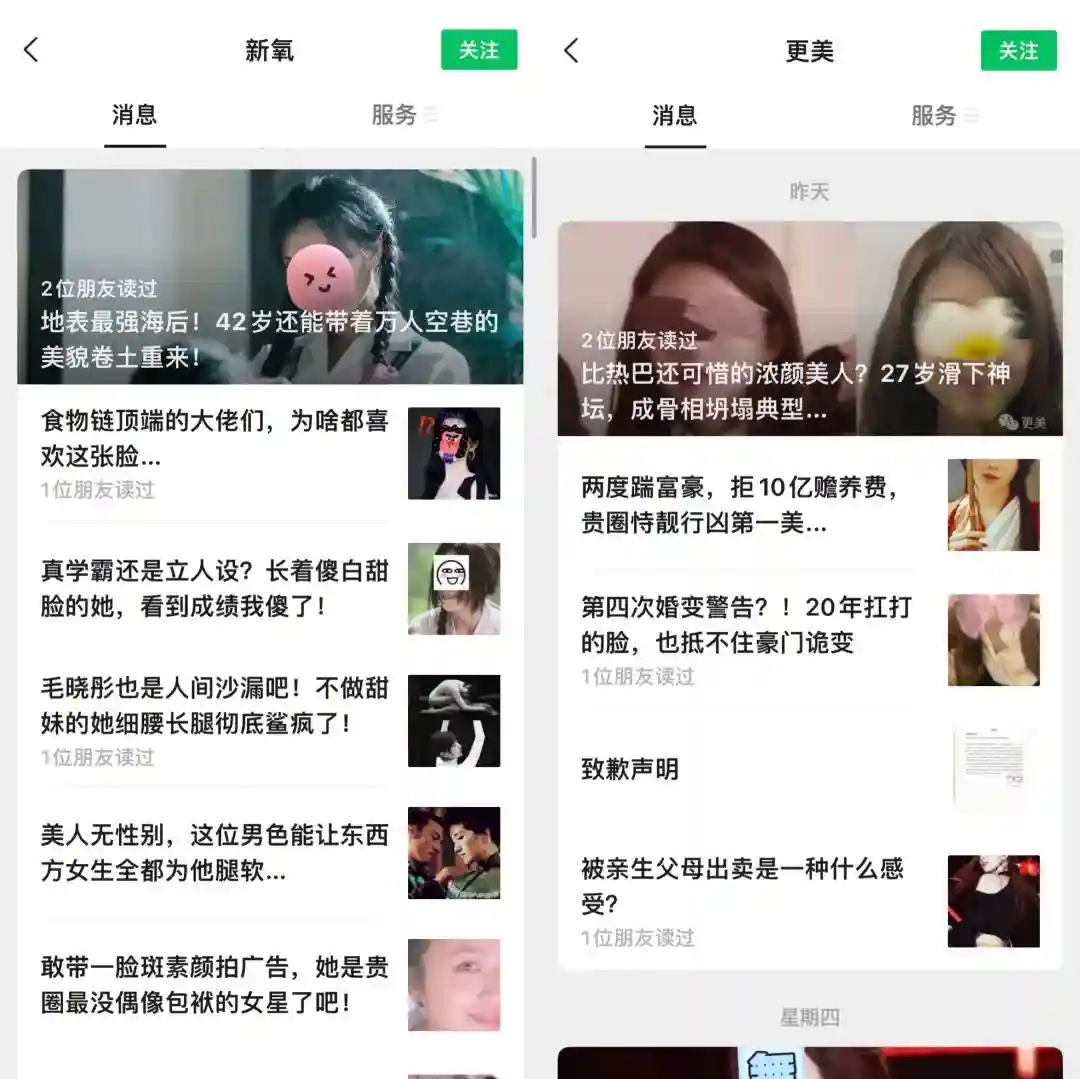 明星图片、内涵明显的文章再配上尴尬的产品推广,如果只看标题,你一定不会想到以上内容居然日常出现在更美APP、新氧医美APP的公众号中。也正是因为这样的宣传,新氧、更美两大医美平台近日被多位明星起诉。