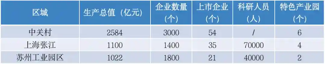 表2:三大园区生物医药整体情况,注:上海张江、苏州工业园区为2020年数据,中关村为2019年数据。