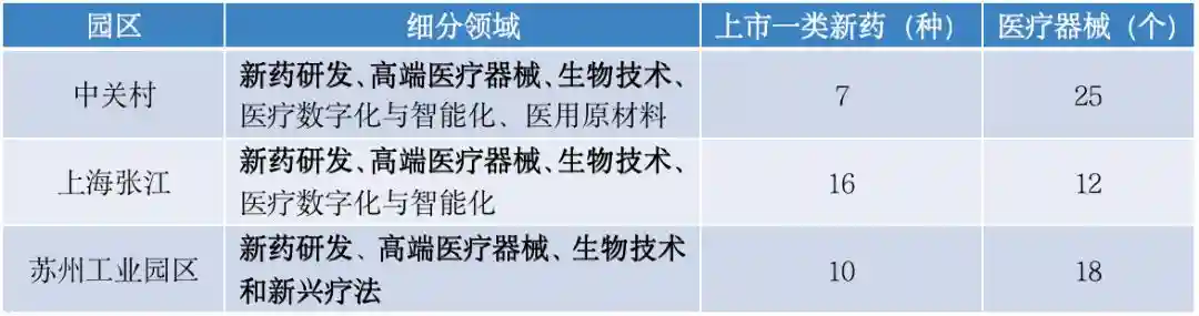 中关村、上海张江、苏州工业园区都将新药研发、高端医疗器械、生物技术作为发展生物医药产业的三大主攻方向,致力于探索新药研发由模仿创新向原始创新转变,加速推进高端医疗器械国产替代,促进生物技术蓬勃发展,助力我国生物医药重点领域从国际“跟跑”向“并跑”“领跑”迈进。