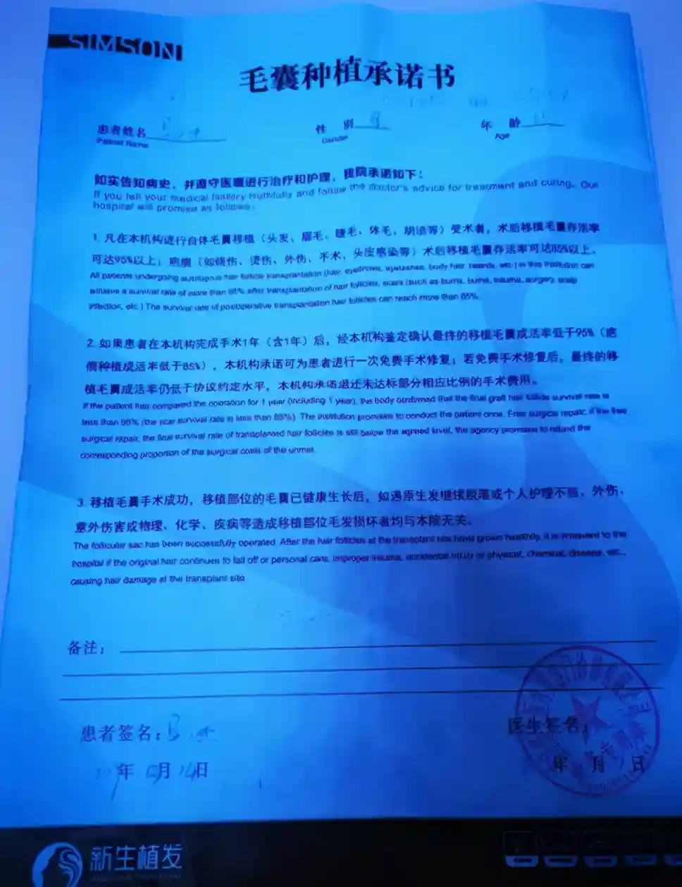 “去年11月在广州新生植发华南总院做的植额角手术,2100多个毛囊一共花了不到2万元,植发前新生承诺一年后毛囊存活率在95%以上,达不到则退款,今年11月去复查,结果显示存活率根本没达到95%,但新生却找各种理由拒绝退款,称不认可其他医院的检测报告,只能以他们的检测报告为准。”来自广州的丘先生投诉称,自己当初是被新生植发宣传的“保障手术100%成功,毛囊存活率超95%且终身不脱落”所吸引,如今手术效果未达预期,还要花费大量时间及精力进行维权。