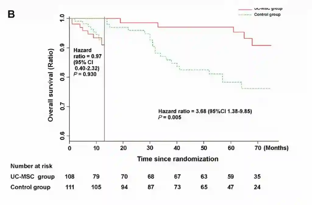 有效性:间充质干细胞治疗明显改善了患者肝脏功能,恢复了各项肝脏指标,通过Landmark分析,在13个月至75个月的随访时间,脐带间充质干细胞治疗组的总生存率明显高于对照组。