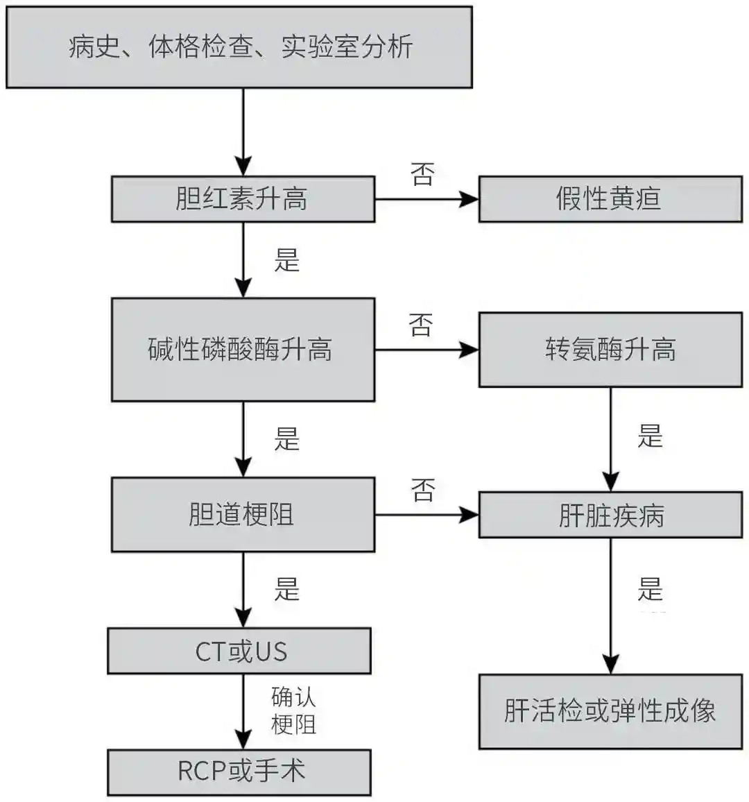 黄疸的一般诊断方法应结合详细的病史、仔细的临床检查以及适当的实验室和影像学检查。图1总结了黄疸的诊断流程。
