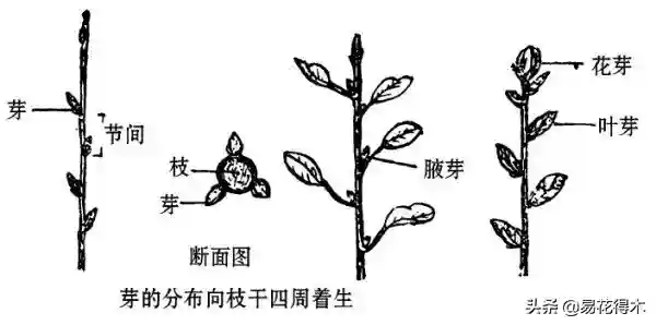 枝芽(叶芽)根据位置不同分为顶芽、腋芽和不定芽;枝芽着生枝干部位并非朝一个方向,而是围绕枝干向四方成螺旋状着生。落叶后非常明显地看出枝芽位置着生在叶腋间,这就是为什么秋冬季落叶后修剪的原因之一,那就是根据芽点的部位,采取有目的的修剪,从而使得增加分枝,并且枝条向预计的方向生长。
