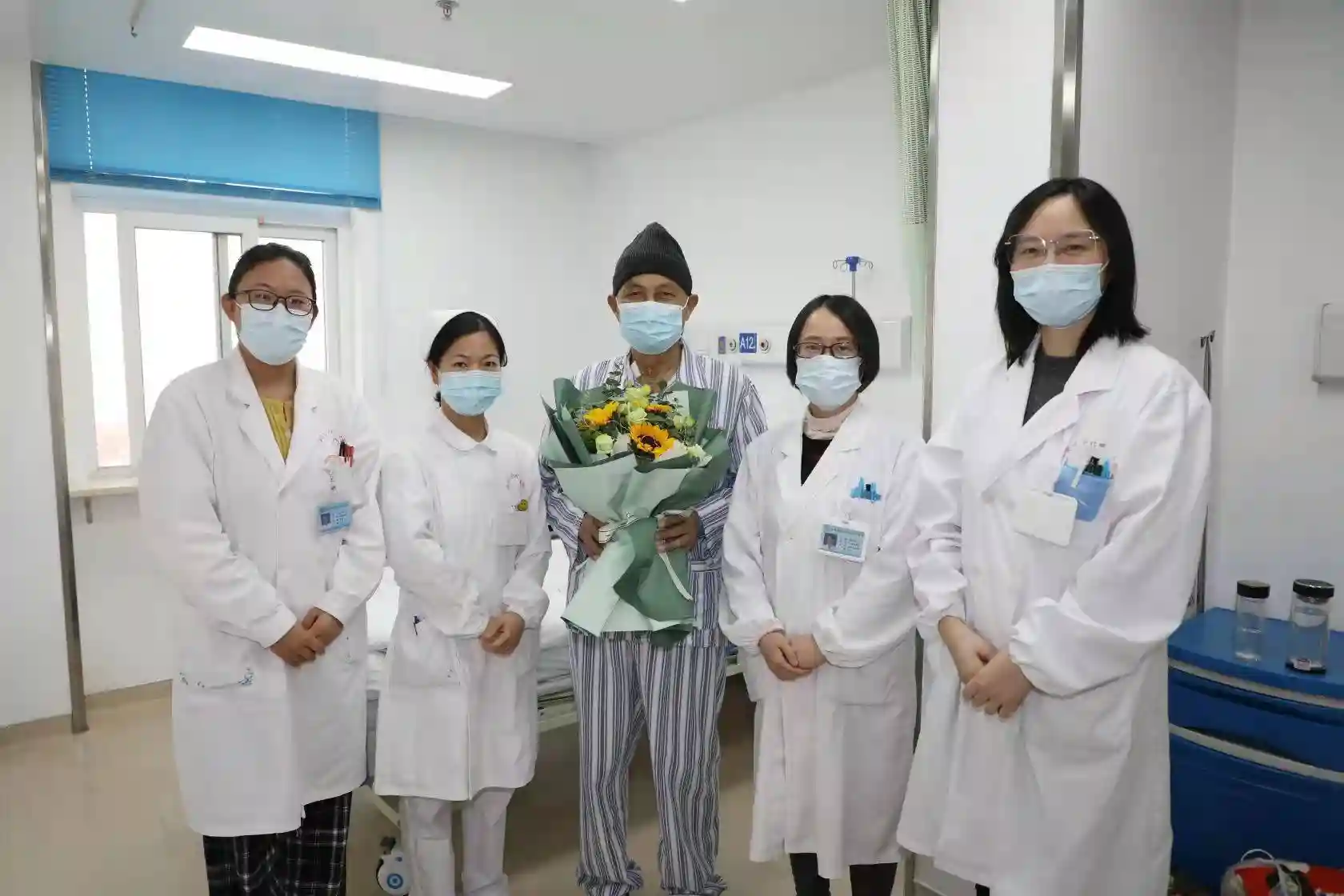 顺利采集完成后,患者正式进入移植仓。入仓后的第一步要进行预处理化疗,目的就是尽可能将患者体内残留的肿瘤细胞杀灭,为准备植入的造血干细胞腾出生长空间。预处理化疗结束后,患者开始回输自体造血干细胞,然后开始等待干细胞植入。随着干细胞成功植入,患者的自身造血及免疫功能也开始逐步恢复。在患者入仓后的第15天,各项检查报告显示骨髓造血功能重建,自体造血干细胞移植成功!当唐先生走出移植仓的那一刻,医护人员为他送上了鲜花,共同庆祝成功移植后的“重生”。