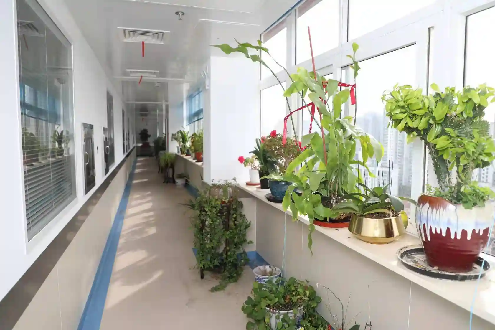 由于骨髓瘤患者进仓治疗期需要近20天时间,一个人处在密闭的环境容易引发患者的抑郁情绪,不利于疾病的治疗。此次新建成的移植仓特地贴心地采用大框玻璃窗,布局可透视窗外的观景走廊,患者接受户外阳光照射的同时,透过玻璃窗还能与家人进行互动交流,获得心理上的慰藉。