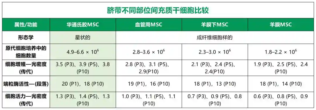 研究人员已经观察到从脐带的不同部分分离的间充质干细胞具有不同的特性。下表比较了从不同脐带区域分离的间充质干细胞特性差异。