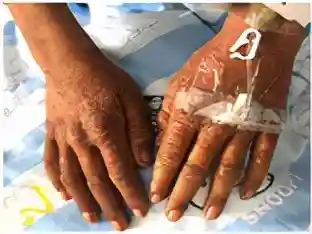 图1患儿双手萎缩性干裂状瘢痕