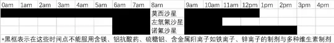 若口服护胃抗酸药(铝碳酸镁、奥美拉唑、雷尼替丁等)可能会影响您所服用的抗菌药物的吸收,如铝碳酸镁、硫糖铝、含金属阳离子如铁离子、锌离子的多种维生素均应与左氧氟沙星、诺氟沙星等喹诺酮类药物间隔两小时服用,如服用前请务必认真阅读说明书,或咨询医师或药师。示意图如下: