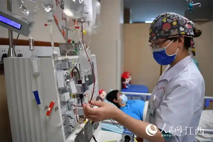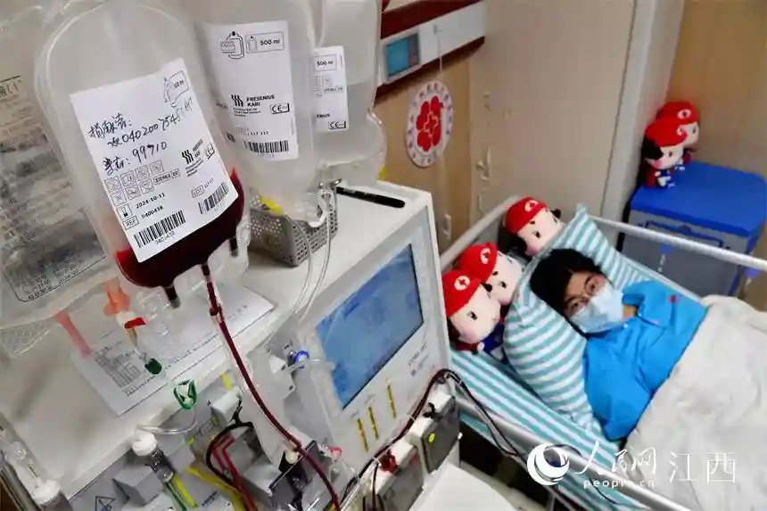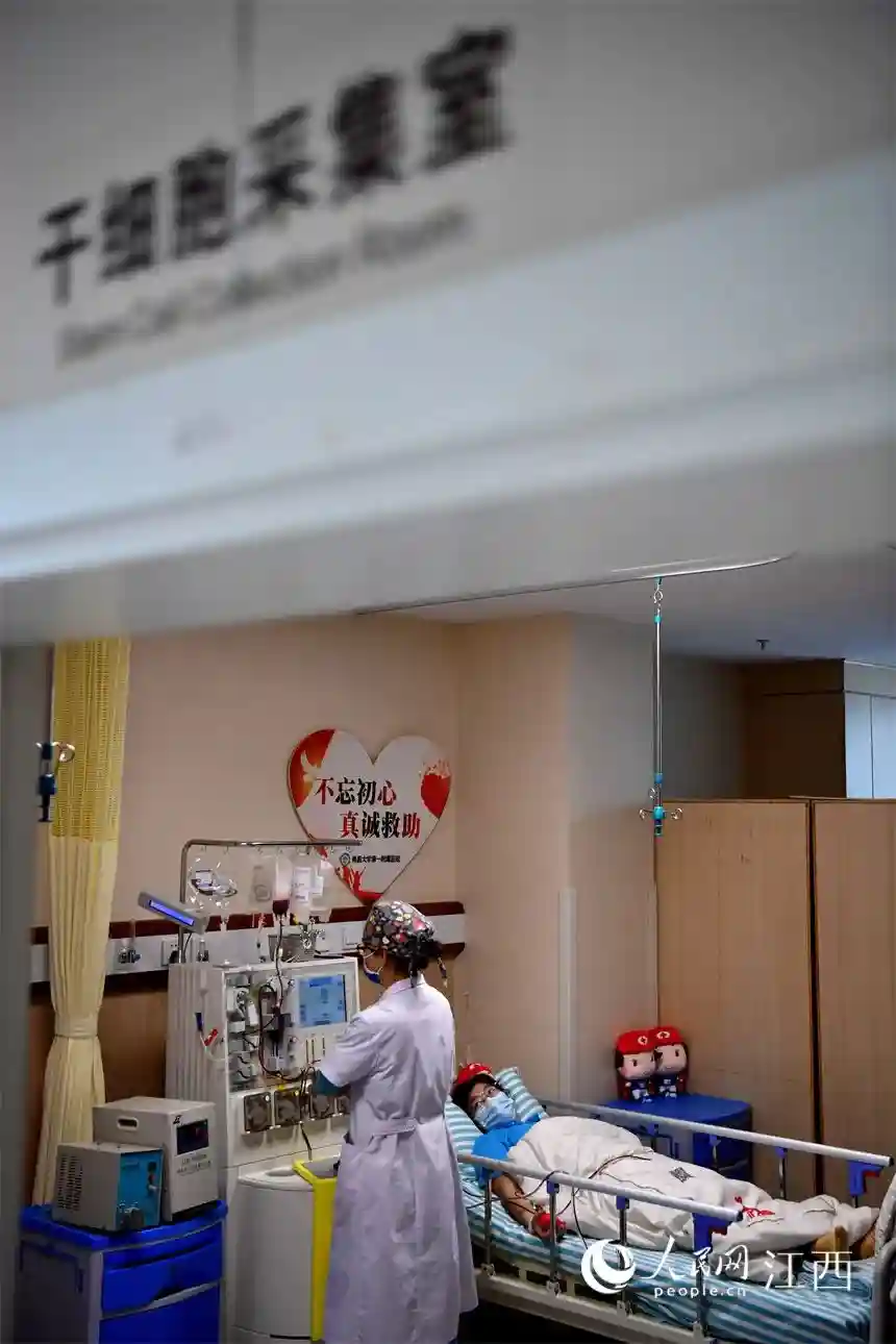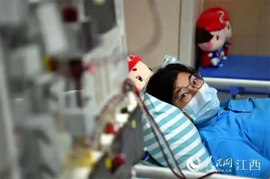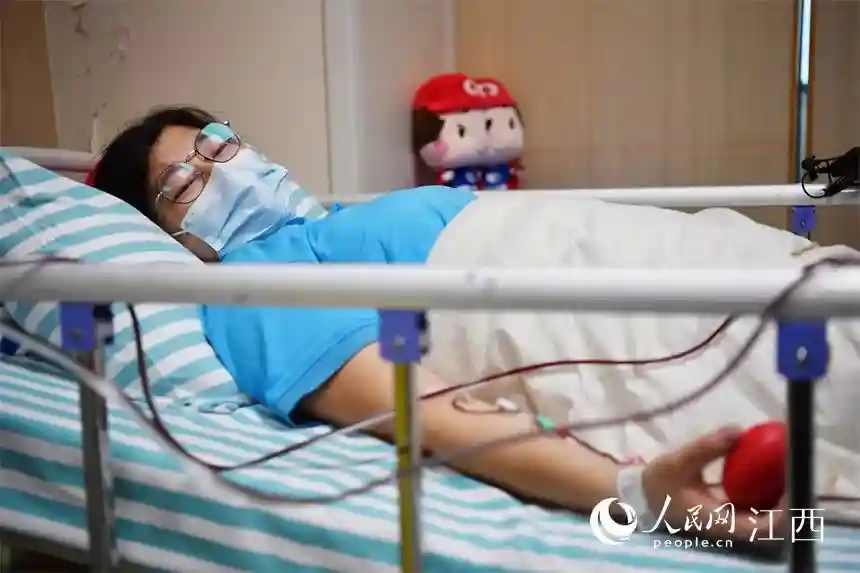 在医院干细胞采集室,小慧躺在床上正在采集造血干细胞。人民网时雨摄