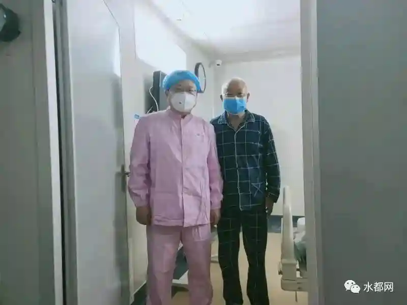 图为患者走出移植仓,与十堰市人民医院血液内科覃骏主任合影