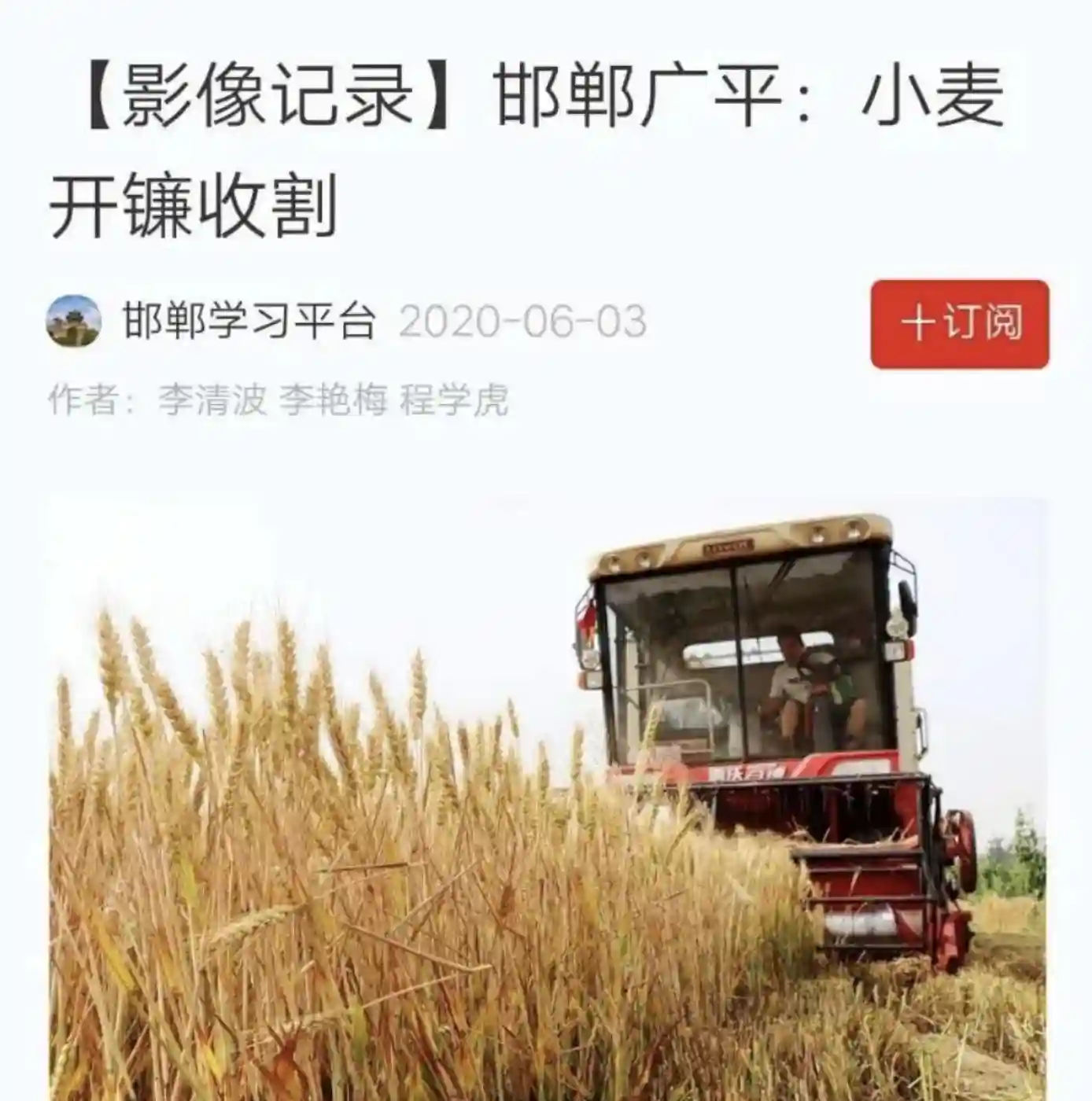 6月2日,邯郸市广平县小麦开镰收割,当地农民抢抓晴好天气收割小麦,确保颗粒归仓。今年夏收,广平县24万多亩小麦长势喜人,丰产丰收已成定局。