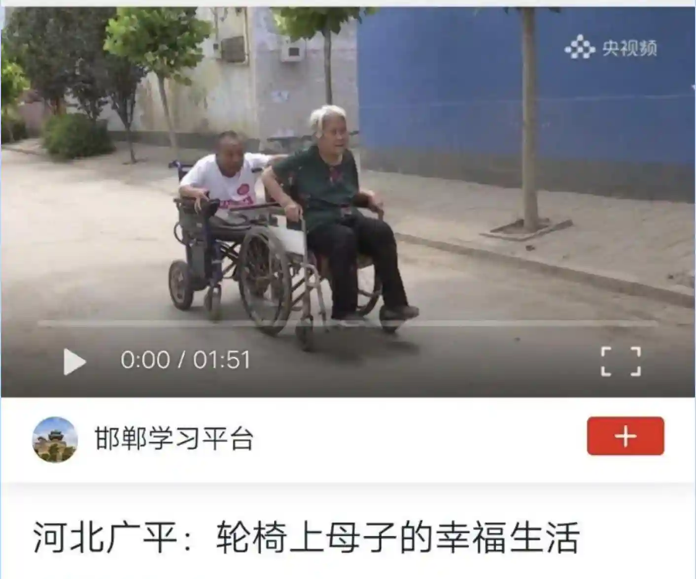 在河北省广平县南韩镇小未庄村的街道上,伴随着一路的笑声,两个轮椅缓慢前行,他们是一对母子,下肢残疾的儿子刘海生和行动不便的七旬母亲。多年来,轮椅上散步的母子已成为这个小村庄别样孝亲风景。