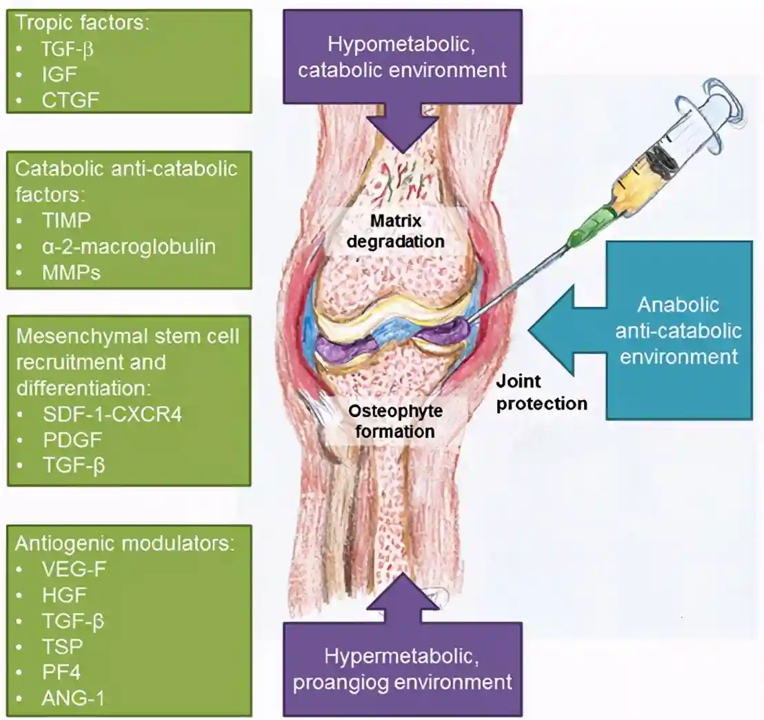 简单说,PRP的软骨保护作用包括四个机制:释放抗炎因子;促进软骨自净;诱导间充质干细胞向软骨细胞分化;促进细胞外基质沉淀。