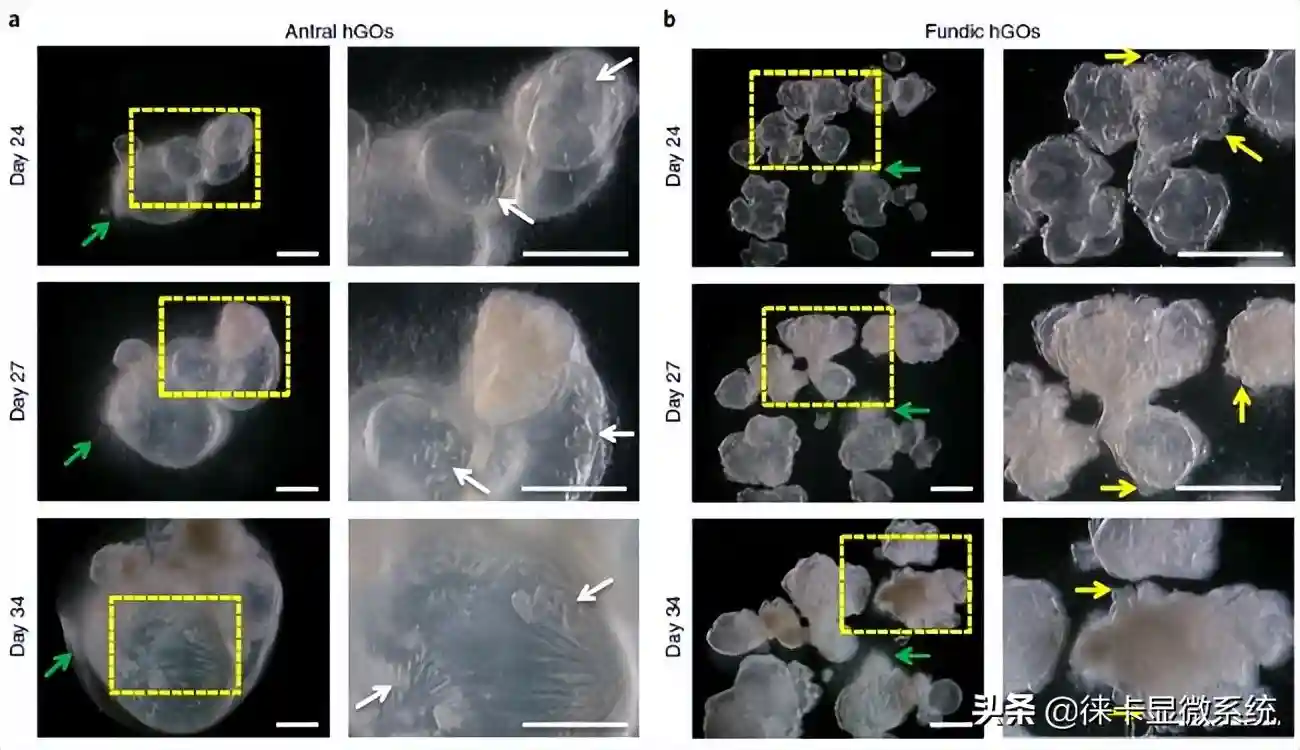 图4–降低了EGF浓度后,在基质胶中生长的hGO中胃窦和胃壁细胞的状态。白色箭头指示hAGO发育出的内部腺体。黄色箭头表示在hFGO中发育出外部腺体的出芽。绿色箭头指示了一个在低EGF浓度下发育出来的神经丛。a,b,在Day24(上排)、27(中排)和34(下排),在基质胶中生长的hAGO和hFGO的低倍(左)和高倍(右)放大图像。a(下排),发育后的hAGO显示有清晰的管腔和旺盛的内部腺体。b(下排),发育后的hFGOs显示有旺盛的外部腺体出芽,腔内可能含有或不含有很多细胞碎片。比例尺,1mm。【注:对下排图像的亮度进行了调整,以使其与其他图像的亮度匹配。】