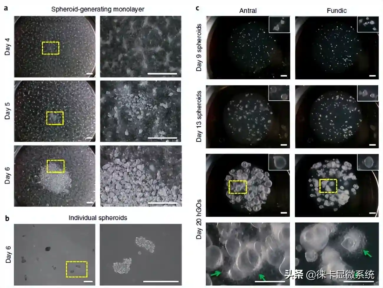 图3-第4-20天,后前肠球状体生成、hAGOs和hFGOs在基质胶中生长相关的形态学变化。a.(上排),第4天的低倍(左)和高倍(右)放大图像,整个孔中出现了可以形成球状体的单层细胞,表现为3D出芽形态。(中排)第5天,可以形成球状体的单层细胞的低倍(左)和高倍(右)放大图像,因为3D形态形成了许多贴壁的出芽球状体和一些自由漂浮的球状体。(下排)第6天的低倍(左)和高倍(右),可以形成球状体的单层细胞(其中有大量可以进行收集的自由漂浮球状体),单层细胞基本上没有3D出芽形态。b.第6天,自由漂浮在培养基中的单个球状体的高倍放大图像。来自同一代的球状体在形状和大小上各不相同,但都被包被在基质胶中以备将来生长。c.在基质胶中的胃窦和胃底球状体在第9天(上排)、第13天(第二排)和第20天(第三排)长成hGO的低倍倍放大图像。插图显示了基质胶中单个球状体的放大图像。(下排)第20天高倍放大的hAGO和hFGO图像,有大量非计划的神经生长(绿色箭头)。在选择hGO作进一步培养时,应避免选择这种hGO,以减少密度。比例尺,1mm(a,c),250μm(b)。白色方框内的插图是5倍数字放大的图像;插图的宽度为~833μm(c)。【注:对c的上排图像亮度进行了调整,以使其与其他图像的亮度匹配。】