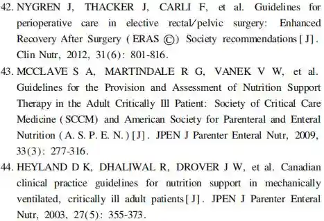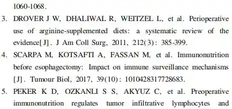 免疫营养的最佳应用时机:2019年McKayBP等【11】比较了因肝癌接受肝脏手术的患者术前和围术期接受免疫营养治疗的差别,在系统回顾中纳入了11个研究,共725例患者,发现一个队列研究显示在术前和围术期补充支链氨基酸能够减少全部并发症发生率26.9%,而另一个队列研究则显示术前免疫营养治疗能够减少术后腹水发生率25.4%,但不影响全部并发症发生率;4个研究表明免疫营养不能减少术后并发症的发生;术前和围术期给予支链氨基酸对术后病死率没有影响。KanekiyovS等【12】于2019年发表了对围术期(术前7d术后7d)应用免疫营养对行食管切除术的食管癌患者影响的研究结果,发现术后第1、7和14天免疫营养组患者的视黄醇结合蛋白水平显著高于对照组(分别为p=0.009、p=0.004、p=0.024);其术后感染并发症明显少于对照组(p=0.048);术后重症监护病房或住院时间在两组间无明显差异;免疫营养组和对照组5年无进展生存率分别为75%和64%(p=0.188),总生存率分别为68%和55%(p=0.187),结果表明围术期应用免疫营养治疗能够改善术后早期营养状况,减少术后感染并发症的发生。许多指南就消化道肿瘤患者营养治疗的持续应用时间及人群提出建议,推荐等级均较高,且近年的指南推荐更加确切,推荐级别较前有所提高:欧洲临床营养和代谢学会(EuropeanSocietyforClinicalNutritionandMetabolism,ESPEN)指南认为,胃肠道大手术患者术前和术后应用包括精氨酸补充饮食在内的营养制剂,能明显降低术后感染率并缩短住院时间。2012年ESPEN【13】针对胰十二指肠切除术的患者,推荐在围术期5~7d应用口服免疫营养素,以减少术后感染并发症(证据级别:中;推荐级别:弱);针对存在营养不良风险的结肠手术患者,应考虑给予免疫营养治疗。应尽可能缩短术前禁食时间,术后应尽早开始正常进食,并可口服补充免疫营养制剂【14】。含有免疫营养素(精氨酸、谷氨酰胺、ω-3不饱和脂肪酸和核苷酸)的口服营养补充可使患者临床获益:减少术后并发症并缩短住院时间。ESPEN指南认为,虽然当时的研究结论存在一定的异质性,但对于营养不良的患者,免疫营养可能发挥更好的效果,所以指南仍推荐了免疫营养素的应用,但也指出其循证医学证据并不充分(证据级别:低;推荐级别:弱)。而2016年的ESPEN指南的更新版本中【15】,对上消化道肿瘤患者,推荐在传统围术期应用口服/肠内免疫营养制剂(证据级别:高;推荐级别:强),指南认为虽然单一免疫营养素的作用尚不明确,但临床研究表明围术期应用免疫营养制剂能减少术后感染并发症,对于术后存在严重营养不良风险的上消化道肿瘤患者十分必要。2015年,中华医学会肠外肠内营养学分会(ChineseSocietyforParenteralandEnteralNutrition,CSPEN)指南指出:药理学剂量的鱼油脂肪乳剂,可用于结肠癌术后患【16】。它能改善临床预后,包括减少血清IL-6、TNF-α水平,减少术后感染和全身炎性反应综合征发生,并缩短住院时间(A级证据)。