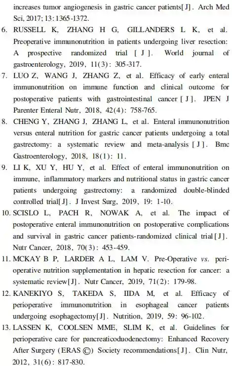 免疫营养的术后应用:2017年LuoZ等【7】报道了术后应用免疫营养治疗对胃肠肿瘤术后并发症、炎性反应及免疫指标影响的研究结果,相较于肠外营养组,免疫营养组患者在术后30d,有更短的住院日和更高的体质指数(p<0.05),但两组间总住院费用和短期术后并发症差异无统计学意义,免疫营养组患者外周血CD4+T细胞、NK、NK/T细胞及CD4+/CD8+T细胞比例显著上升,IL-2、干扰素-y分泌增多,TNF-α、IL-10分泌减少,细胞活化标志物CD27和CD28表达更高,无并发症生存期更长(p=0.04)。2018年最新的一项荟萃分析纳入了7项RCT共583例胃肠道肿瘤患者,发现术后免疫营养应用多于7d组患者的淋巴细胞总数、CD4+T细胞、CD4+/CD8+T细胞比例增加,前白蛋白水平增加,然而上述指标在术后免疫营养应用时间<7d的患者中升高并不明显,应用免疫营养的患者全身炎性反应综合征以及术后并发症显著减少,提示长期免疫营养能改善细胞免疫、调节炎性反应、减少术后并发症【8】。2019年LiK等【9】进行了术后免疫营养治疗对胃切除的胃癌患者免疫功能、炎性反应和营养状态影响的研究,发现免疫营养组患者CD4+TB细胞、CD3+T细胞、CD4+/CD8+T细胞比值、IgG、IgM和IgA水平显著高于对照组,同时白细胞、CRP和TNF-α的水平显著低于对照组,但营养指标没有变化,表明术后免疫营养能提高患者的免疫功能,改善炎性反应。值得注意的是,2018年ScisloL等【10】发表的一项纳入了98例胃癌患者的随机临床试验报道了胃癌患者术后肠内免疫营养对术后并发症和生存率的影响,结果表明,与标准肠内营养相比,术后予肠内免疫营养可减少呼吸系统并发症和术后病死率,但免疫营养组的6个月和1年生存率并没有提高。