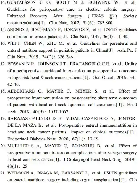 2.1.2头颈部肿瘤手术患者的免疫营养治疗2016年一项前瞻性队列研究,共纳入了195例高危头颈部肿瘤患者,与对照组相比,免疫营养组术后瘘管形成明显减少(p=0.007),住院时间平均缩短2.8d(p=0.02)【17】。2018年一项回顾性分析共纳入411例头颈部鳞状细胞癌患者,术前应用免疫营养制剂5d,发现与对照组相比,试验组住院时间显著缩短(6dvs8d;p<0.001),局部感染率显著减少(7.4%%;p=0.006)【18】。此外,2019年一项针对接受手术治疗的头颈部肿瘤患者的回顾性研究发现,与对照组相比,术后接受富含精氨酸肠内营养的患者的瘘管发生率较低(17.91%%;p=0.047),并且平均住院时间较短[28.25()()d;p=0.030]【19】。同年,有研究发现在复发性头颈部鳞状细胞癌的补救性手术中,术前免疫营养可以较好地控制并发症的发生率并缩短住院时间,这意味着免疫营养可能有助于改善这一高危人群的手术结果【20】。2006年ESPEN指南将颈部肿瘤手术患者围术期应用肠内免疫营养治疗作为A级推荐【21】。另外,HowesN等【22】根据Cochrane等数据库于2018年发表了一项纳入了19个随机对照试验(包括1099例参与者)的系统评价,评估了与标准喂养相比,免疫营养治疗对接受选择性头颈癌手术的成年患者术后恢复的影响,发现和对照组相比,免疫营养治疗虽然不能影响住院时间、伤口感染率和全因死亡率,但可降低术后瘘管形成的风险,其标准护理和免疫营养组瘘管形成的绝对风险分别为11.3%和5.4%,RR为0.48(95%CI=0.27~0.85)。