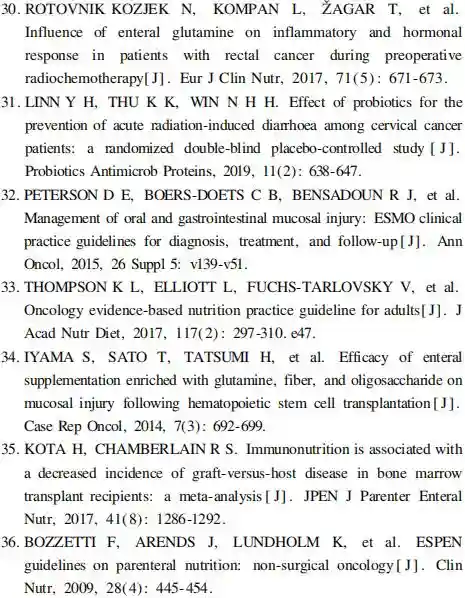 2.2.2肿瘤患者放疗与免疫营养治疗2017年一项关于口服谷氨酰胺对放疗(或)化疗的头颈部肿瘤患者黏膜炎和皮炎影响的双盲RCT中发现,与安慰剂组相比,谷氨酰胺组黏膜炎发生率更低,但两组差异无统计学意义(p=0.324);而其黏膜炎的发生率显著减少(p=0.038),严重程度显著降低(p=0.032)【29】。2017年一项关于直肠癌患者术前新辅助放化疗过程中应用肠内谷氨酰胺治疗对其炎性反应和激素反应影响的RCT研究发现,与安慰剂组相比,谷氨酰胺组患者血浆IL-6水平更低(5.5±3.8ng/±5.2ng/L;p=0.02),而谷氨酰胺组患者血浆皮质醇水平在接受谷氨酰胺后也显著降低(386.5±168.4nmol/±111.7nmol/L;p=0.03),提示口服谷氨酰胺有一定抗炎作用,进而减少放化疗期间的激素应激反应。另外,2018年一项关于口服益生菌治疗宫颈癌放疗导致的腹泻的RCT发现,益生菌组较安慰剂组患者腹泻率显著降低,2级腹痛发生率显著减少,腹痛时间显著缩短【31】。