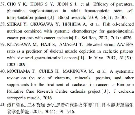 指南对肿瘤患者恶液质状态的免疫营养治疗推荐强度和级别都非常低,不论是早年和近期的证据都很少,不足以支撑临床推荐。2016年EPCRC更新临床指南时进一步强调,虽然在某些研究中发现了它们的某些益处,例如β-羟基-β-甲基丁酸(β-hydroxy-β-methybutyrate,HMB)、精氨酸和谷氨酰胺联合应用4周后能增加肺癌患者瘦体组织等。但仍没有足够的证据推荐在恶液质肿瘤患者中应用这些营养素【40】。2016年ESPEN指南指出,对于接受化疗且存在体重丢失和营养不良风险的进展期肿瘤患者,建议应用含长链ω-3脂肪酸或鱼油的营养添加剂,以稳定或改善食欲、食物摄入、瘦体组织和体重(推荐强度:弱,证据强度:低)【15】。此外,对接受抗肿瘤治疗的全身炎性反应和恶液质的晚期肿瘤患者,支链或其他氨基酸或其代谢产物,包括HMB、精氨酸和谷氨酰胺能否被推荐应用于改善体重下降,目前尚无充分的临床证据(推荐强度:无,证据水平:低)。恶液质状态常伴系统性炎性反应,对此,2015年日本肠外肠内营养学会指南指出,可推荐尝试应用所谓特殊药物疗法(特殊药物疗法),其包括不饱和脂肪酸(EPA等)在内的免疫营养素,可通过下调NF-kB(核因子激活的B细胞的k-轻链增强,nuclearfactor-kβ)活性、抑制炎性反应性细胞因子等机制以拮抗系统性炎性反应,从而让患者获益【41】。