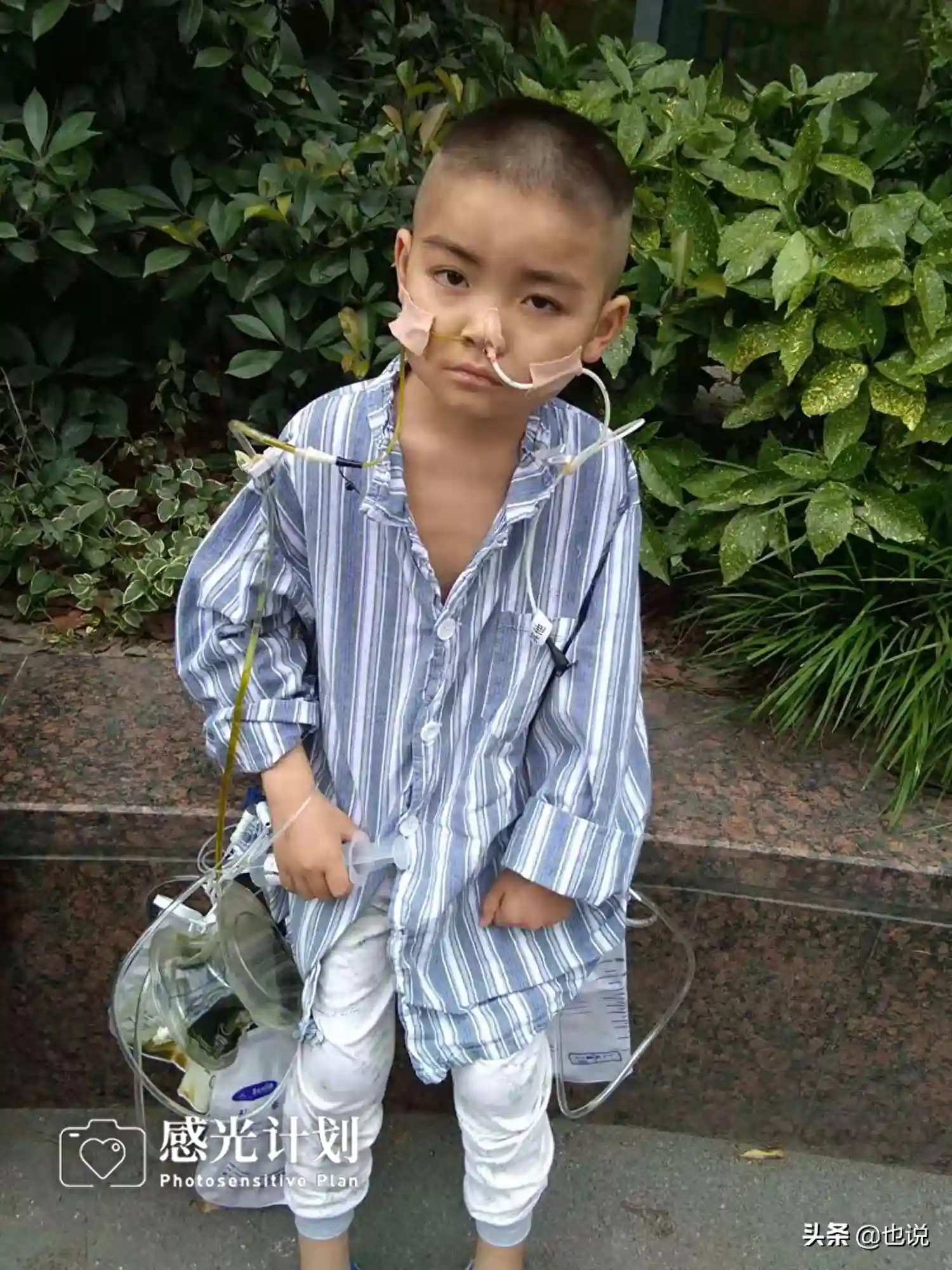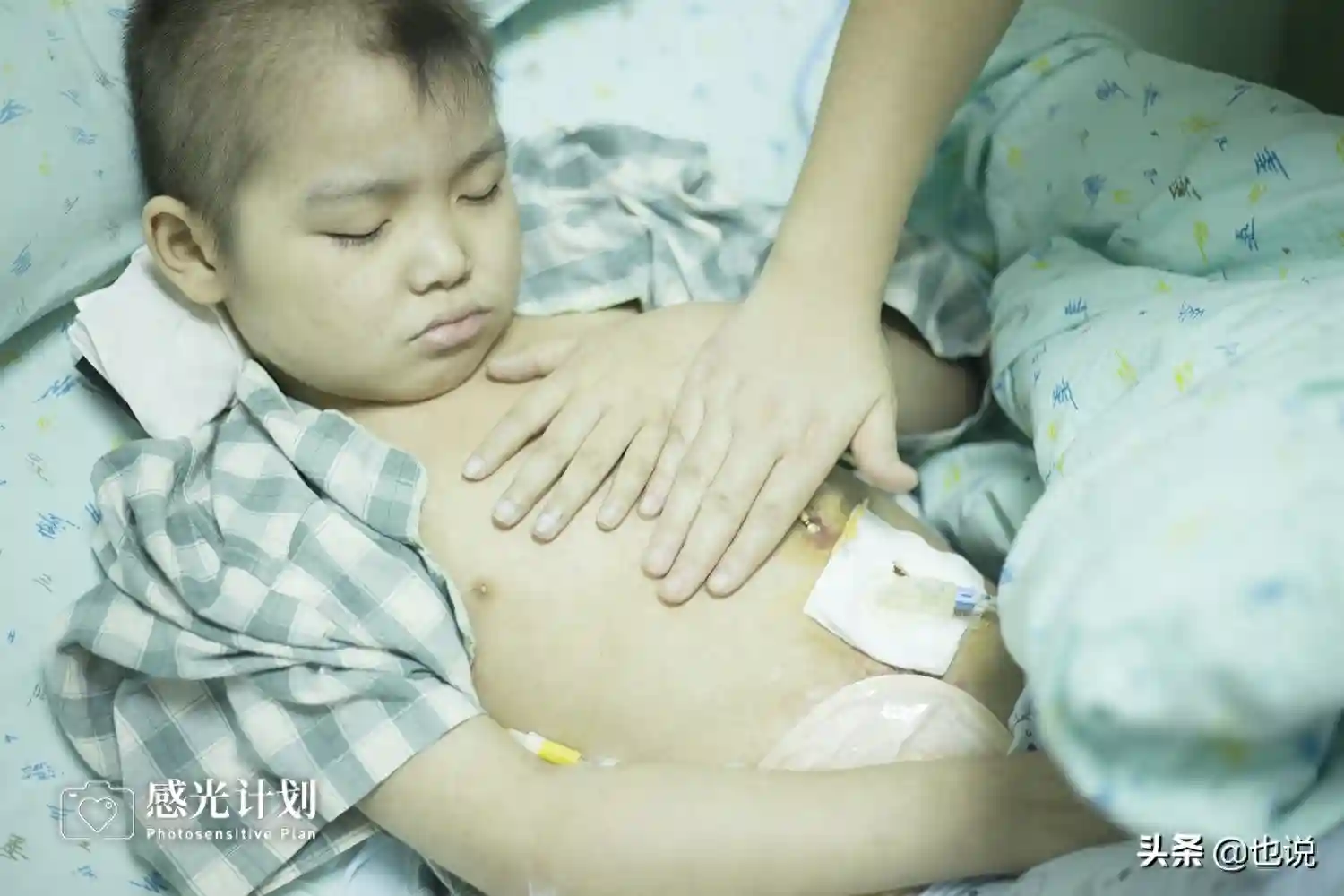 今年5月,奥琪病情再次恶化,每天肚子疼痛难忍,疼的厉害的时候,就打自己的头。6月份又来上海看病,但是奥琪的病情没得到控制,反而开始吐血便血。7月奥琪转到了南京的医院,医生说可能肠道出现溃烂,建议先手术治疗。很快开始禁食,手术排队期间,疼痛每天都会来。奥琪一个月没吃东西,没好好睡过一个觉,他抓着我的手说:“妈妈,能不能给我止疼药吃,让我睡觉,只要不痛怎样都行”。