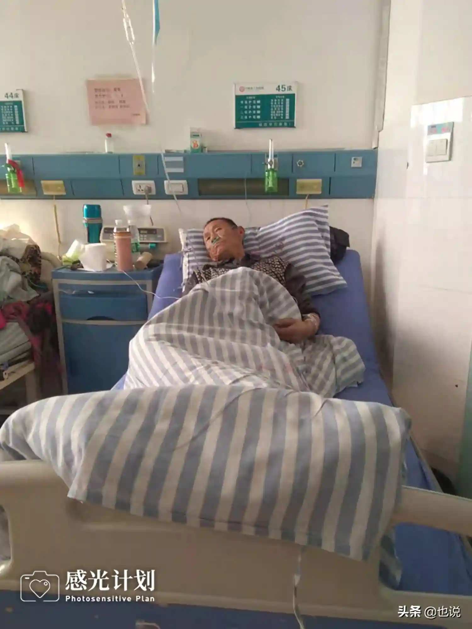 我怕奥琪再次轻生,从此寸步不离守着他。我老公虽然只是初中毕业,之前去工地干活,也能维持家里的生活,但是因为儿子生病现在要随时待命,没办法找长期工作,只能打零工,运气好的话一天赚二百多,但却连奥琪一天的奶粉钱都不够。我大伯是个聋哑人,二伯和和公公年轻时每天扛洋灰,扛了大半辈子,早早成为被尘肺病折磨的“废人”。图为奥琪爷爷在医院治疗尘肺病。2019.11河南