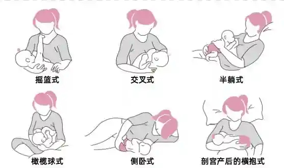 剖宫产后的横抱式:剖宫产术后因活动受限、伤口疼痛等因素,可以尝试半躺式,让宝宝避开伤口横趴在妈妈胸前的姿势哺乳。