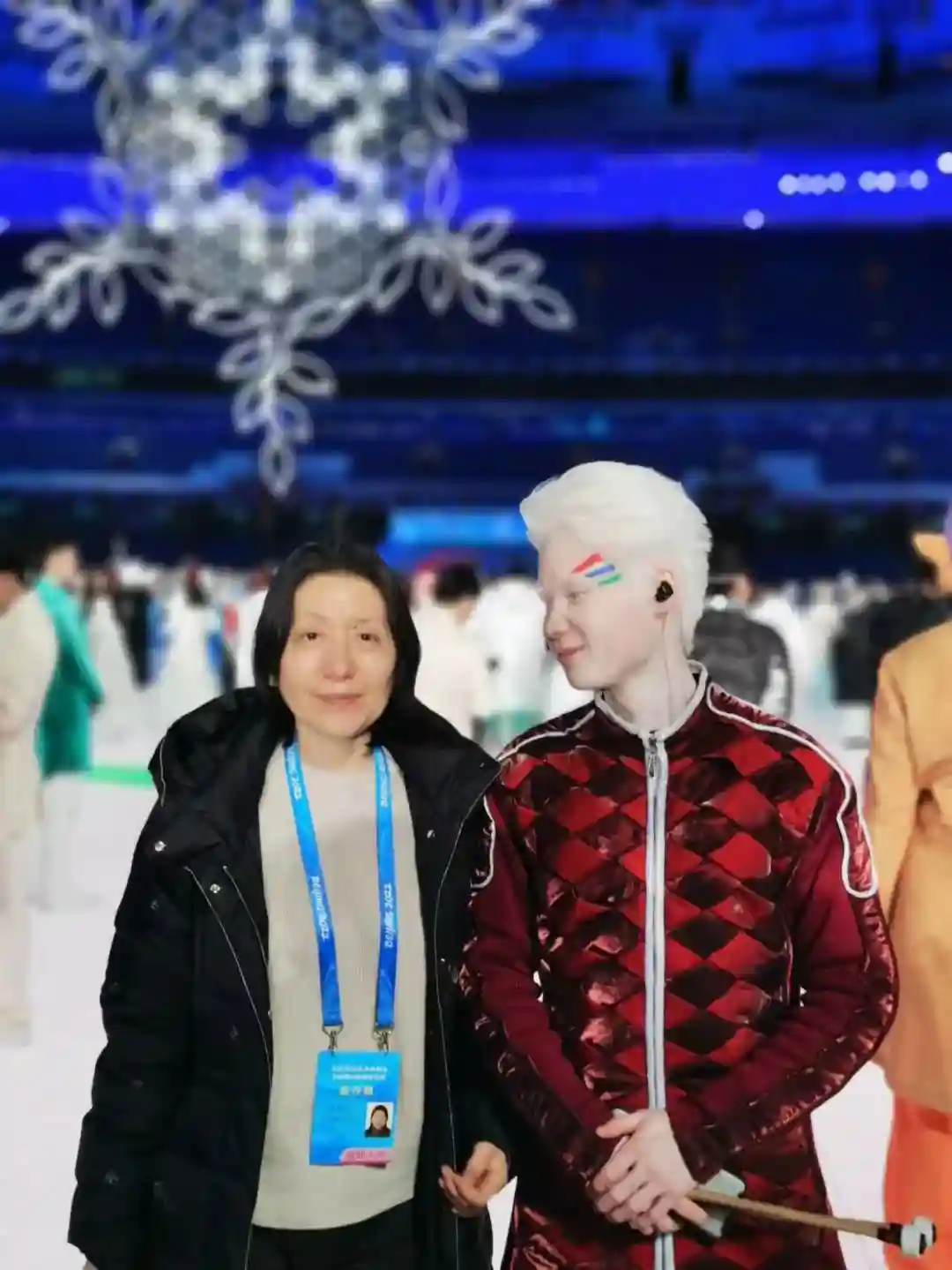3月13日晚,北京2022年冬残奥会闭幕式结束后,音乐学专业负责人张爱民(左)和2021级学生、定音鼓鼓手王得江合影。(受访者供图)