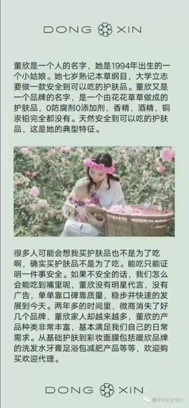 董欣首先它是一个有灵魂的企业和品牌——坚持不能吃就不能用的纯天然护肤品品牌!其次是它的良心产品,所有产品在国家药监局都有备案以及美丽修行APP里,都可以查到成分和安全性,真正的纯天然0添加的护肤品,还有它的与众不同,公司成立至今已经将近5年时间,没有任何的广告宣传和明星代言,为的就是把最大的利润给到我们的顾客,把更多的钱放在原材料和制作工艺上,让我们的顾客都可以用到最好的纯天然产品,因为是老板大学期间自主研发的品牌,所以产品定价都比较低,为的就是打造中国第一纯天然且人人都能用得起的健康安全护肤品!