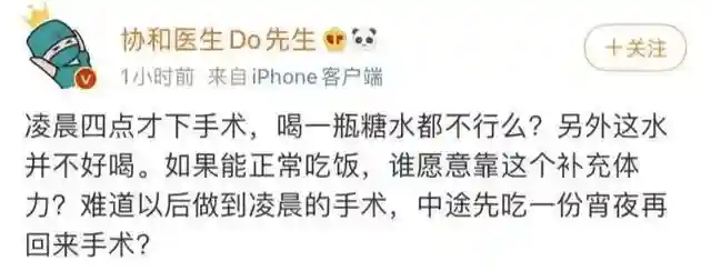 记者注意到,郑涛的个人账号下,目前已经有4.2万条留言,许多医疗大V和网友都纷纷留言声援。医疗大V“协和医生Do先生”留言称,凌晨四点才下手术,喝一瓶糖水都不行么?另外这水并不好喝。如果能正常吃饭,谁愿意靠这个补充体力?难道以后做到凌晨的手术,中途先吃一份宵夜再回来手术?