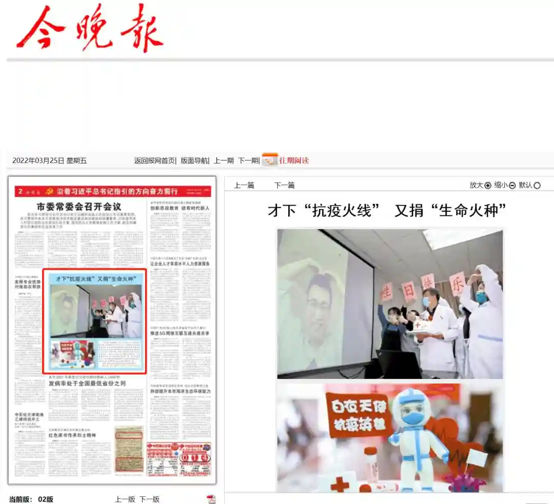 日前,《》《今晚报》分别刊发《过一个代表“重生”的生日》《才下“抗疫火线”又捐“生命火种”》,报道我区陈医生在他生日当天顺利完成造血干细胞采集,成为我市第301位造血干细胞成功捐献者。
