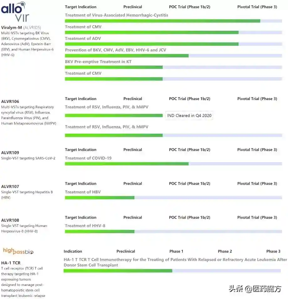 其中,Allovir的主要产品Viralym-M(ALVR105)旨在治疗免疫功能低下患者(包括造血干细胞/实体器官移植患者、原发性免疫缺陷、癌症、HIV患者)的活动性病毒病,其可以同时治疗多达6种不同的病毒感染。HighPassBio则正在开发靶向表达HA-1肿瘤的HA-1TCR-T细胞疗法,旨在治疗造血干细胞移植后的白血病复发。
