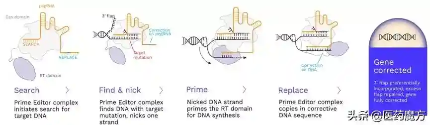 Prime开发的先导编辑(primeediting)是一种新型基因编辑技术,对基因进行的编辑处理过程类似于用文字处理器修改拼写错误,通过“搜索”来“替换(写入)”DNA,而且这种编辑不会导致DNA双链断裂。