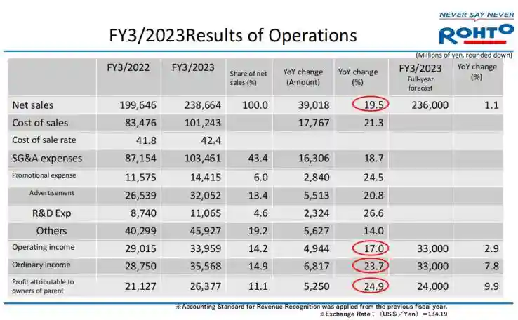 药融云数据,显示:随着日本和海外经济活动复苏、消费者信心恢复,以及受到日元贬值的影响,乐敦制药2023财年(2022年4月1日至2023年3月31日)综合净销售额2386.64亿日元(17.81亿美元),同比增长19.5%,同时各项开支也有所增加,具体如下图。2023财年营业利润达到了339.59亿日元(2.53亿美元),同比增长17%;经常利润(公司主业以外的收益)为335.68亿日元(2.51亿美元),同比增长23.7%;归母净利润为263.77亿日元(1.97亿美元),同比增长24.9%。(1美元=134日元)