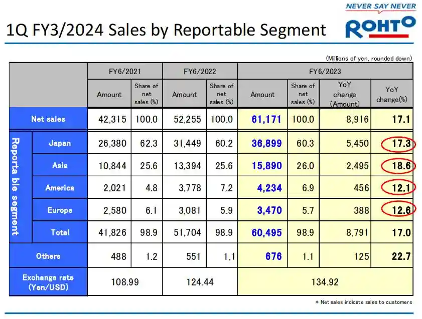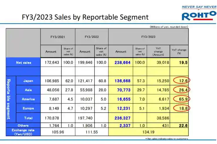 在美洲的净销售额为166.55亿日元(1.24亿美元),占集团综合净销售额的7%,同比增长65.9%,主要是因为HydroxLaboratories在2021年10月成为集团子公司,该公司主要生产和销售医疗消毒剂等产品,对销售增长做出了重大贡献。