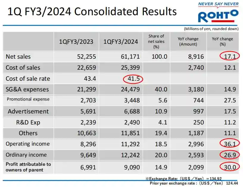 乐敦制药2024财年第一季度(2023年4月1日至6月30日)净销售额大幅增长至611.71亿日元(4.57亿美元,同比增长17.1%),营业利润112.92亿日元(8427万美元,同比增长36.1%),经常利润122.42亿日元(9136万美元,同比增长26.9%),归母净利润为90.9亿日元(6784万美元,同比增长30%)。