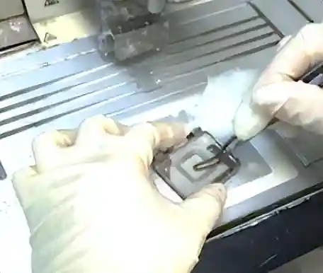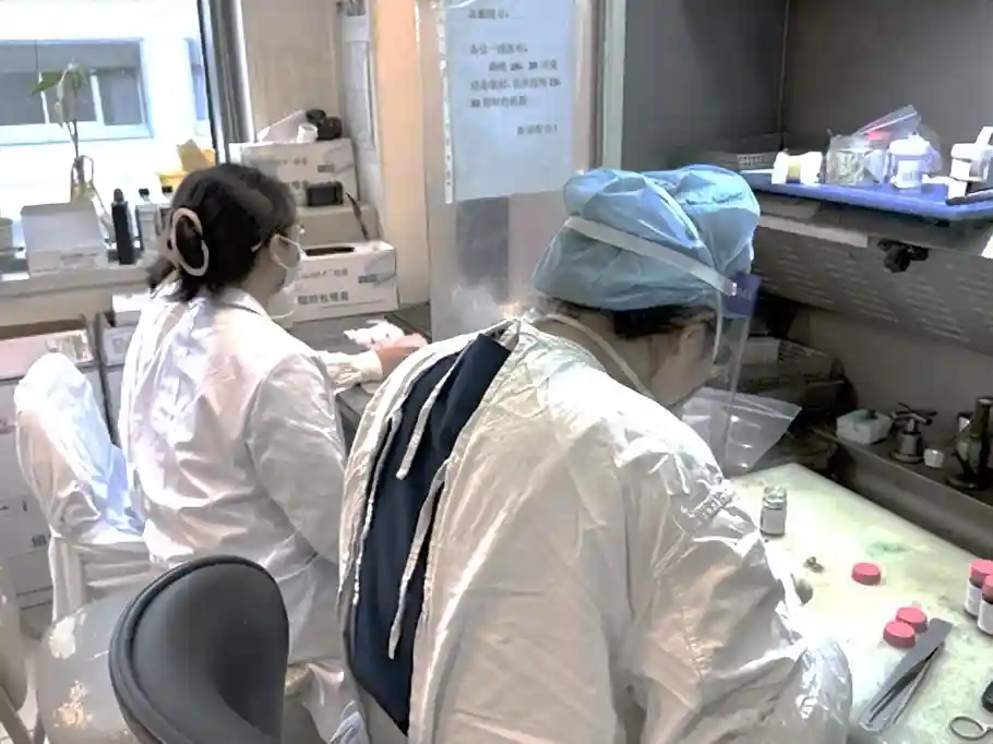 助手将组织薄片捞在病理玻璃片上。