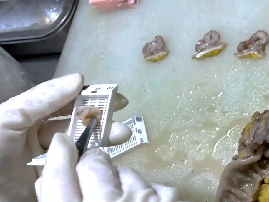 由病理医师或者专门的取材医师进行规范化病理取材,因为标本都泡在10%的中性福尔马林固定,所以这就是为什么取材的时候每位取材医师都全副武装,一不小心就会眼泪鼻涕横流。曾经福尔马林和二甲苯的味道就是病理科的味道,现在条件改善了很多,但每天依然会和它们亲密接触。标本会被代表性地切割成1.5大小的组织块。每位病理医师都能练就高超的刀工,每个人都有被切手的惨痛教训。