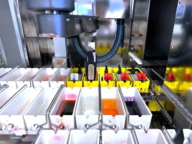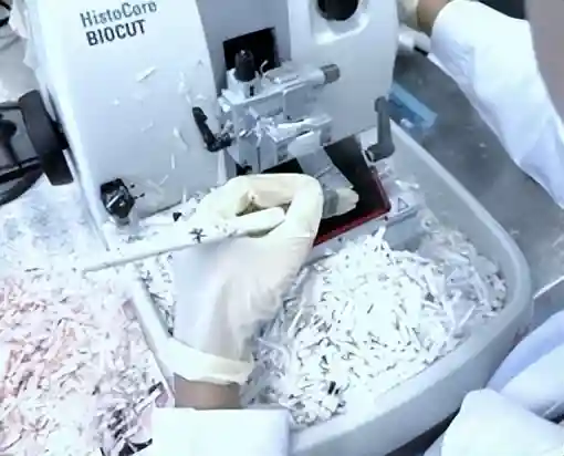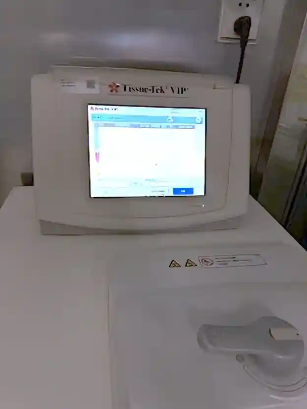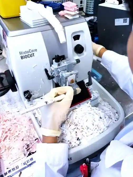 取材的组织块会被放到一个机器内,进行固定、脱水、透明、浸蜡,这个过程需要一整晚,叫“挂篮”。