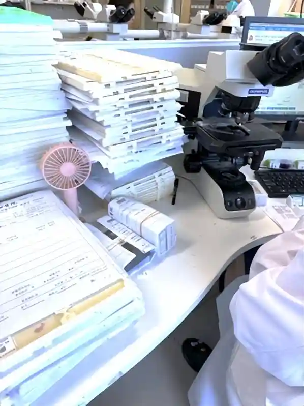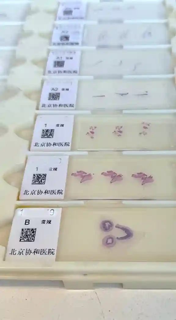 这个时候一张漂亮的粉蓝色切片才算制作成功,可以端给病理医师进行显微镜下观察了,整个过程堪比艺术品的制作。这时往往已经到了下午,医院病理科每天出片HE切片2000~2400张,还不算冰冻切片400~500张、免疫组化切片2000张和外院会诊切片。