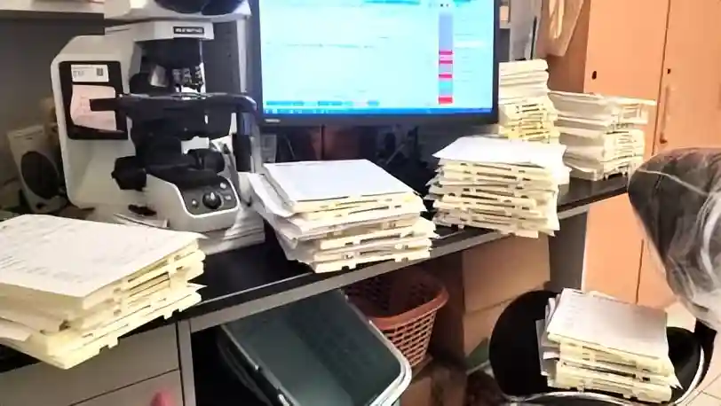 先让一线医师进行初步诊断,既可以锻炼年轻医师的诊断经验,也是多级复查制度的体现。每张片子至少两个人看过,这样可以极大避免低级错误的发生率。之后一线医师一般会在第三天或第四天将全部切片上交二线。病理科放片子的板子一般是20张一板,如此,每位医师大约就是30板,摞起来堪比小山一样高,加之经常要从技术室搬运往返多趟,真的是实实在在的“搬砖人”。